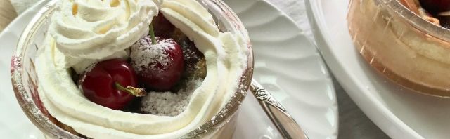 It is cherry season – please make a Cherry Clafoutis. You can make a Cherry Clafoutis in a non-metal pan, or like I did in individual ovenproof ramekins. Butter, then sugar pan/ramekins, line the bottom with cherries, pour the batter over the cherries and bake. The ingredients are almost in all kitchens with the exception the fruit and whipping cream.