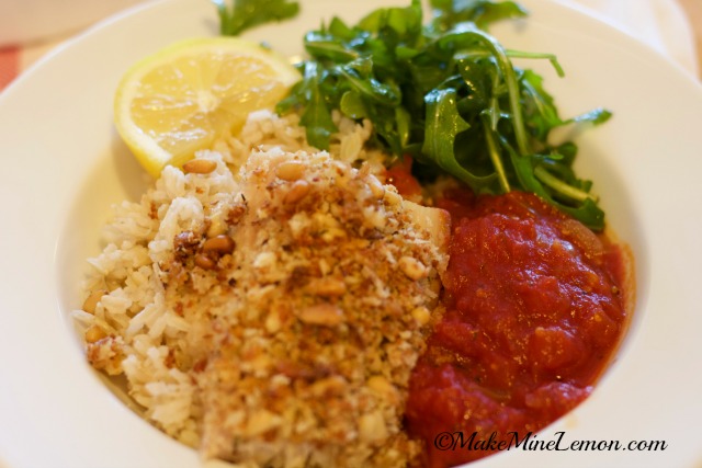 I heard a chef say the difference between the lunch and dinner menu was 2 ounces and twenty dollars. So usually lunch is a six-ounce serving of fish, and dinner is eight. But if you make it yourself you will save even more. This Mahi Mahi Breadcrumbs and Pine Nuts dinner tasted like something I ate at a restaurant only cheaper.