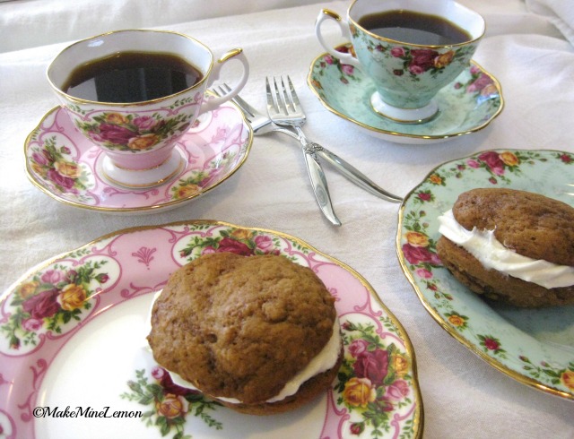 Thank you so much Wini. The plates were a gift from my niece and I have enjoyed them so much. Food seems to taste better in a pretty plate. These little whoopies are light cakes and the icing was so fluffy I shocked myself. Although Rachael said you can freeze them I think they are best to eat as soon as they were cooled and iced. Thanks so much for stopping by, I am always thrilled to hear what you have to say.